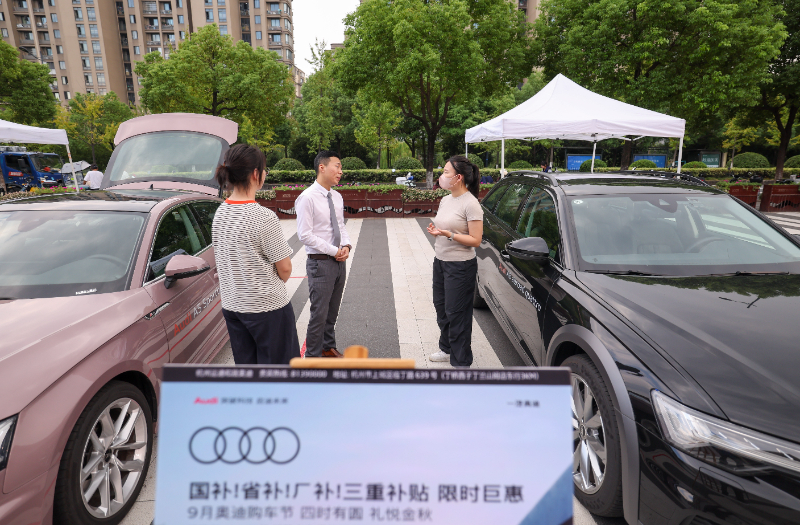 9月27日,经销商(中)在浙江省杭州市上城区丁兰街道组织的“美好生活 焕新出发”消费品以旧换新展会现场向消费者介绍车辆以旧换新政策补贴与品牌优惠的具体情况。