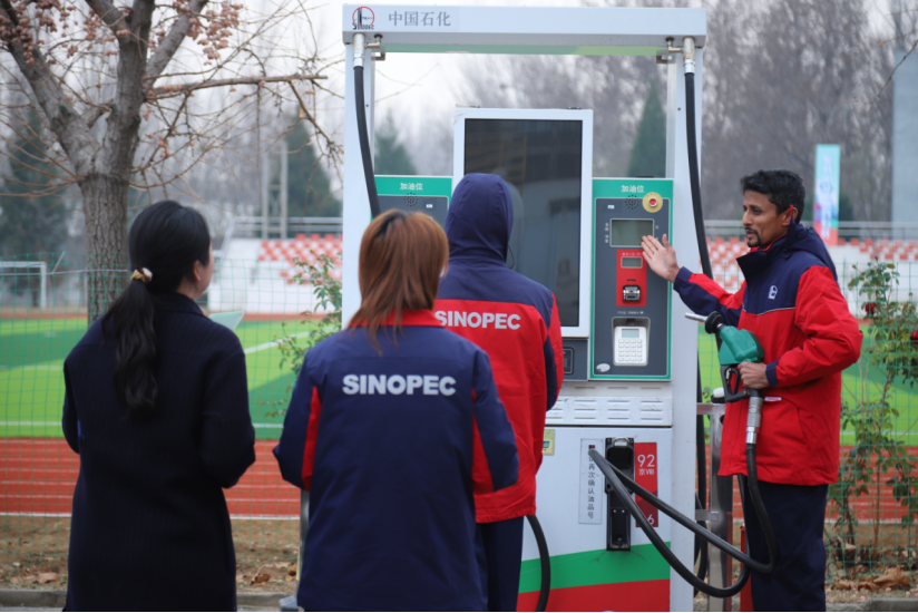 在中国石化北京石油实润加油站,斯里兰卡学员进行沉浸式实训操作。