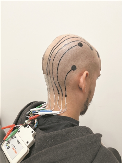 团队在5名头发较短的参与者头皮上打印了墨水。同时,他们也在电子文身旁边贴上了传统的脑电图电极。结果发现,这种墨水在检测脑电波方面的表现同样出色,且噪声极小。