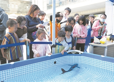 图为公众在科学展示区观看水下仿生机器鱼